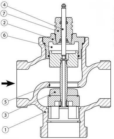 Составными частями трехходового клапана являются: корпус (1), вставка клапана (2), конус клапана (3), полированный штока клапана (4), седло клапана (5), разгрузочная камера (6), сальниковое уплотнение (7)