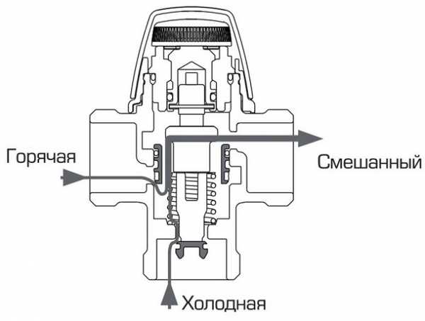 Но тут надо разобраться, по каким законам работает шток, под действием какой силы он опускается или поднимается. Все дело в самой термоголовке. Внутри нее располагается температурный датчик, заполненный специальной жидкостью. Она термочувствительная. Как только температура теплоносителя начнет подниматься, жидкость расширяется и поднимается по капиллярной трубке в специальный сильфон (емкость), который расположен в термоголовке. Резервуар сам начинает расширяться, тем и давит на шток. Последний опускается и открывает нижний патрубок, откуда в трехходовой клапан поступает холодная вода. Горячая поступает с левого патрубка (см. фото).