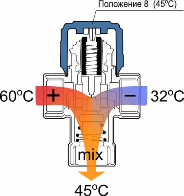 Элемент выбирают на заводе и там же устанавливают, поэтому на клапане обязательно указывают, какая температура на выходе будет после него. К примеру, если вам требуется клапан для теплого пола, то выбираем с температурой 45°.