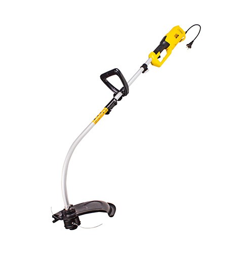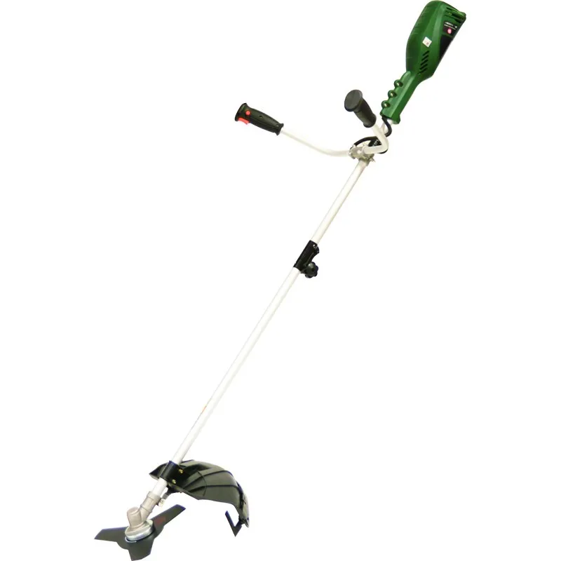 Такие триммеры, как правило, маломощные (175-550Вт), с режущим инструментом в виде лески, струны (триммерный корд), диаметром 1,2-1,6 мм. Применяют их для скашивания оставшихся и недоступных для газонокосилки островков мягкой травы. Поскольку при высокой влажности электрическими триммерами работать запрещается, то при нижнем расположении двигателя это особенно критично.