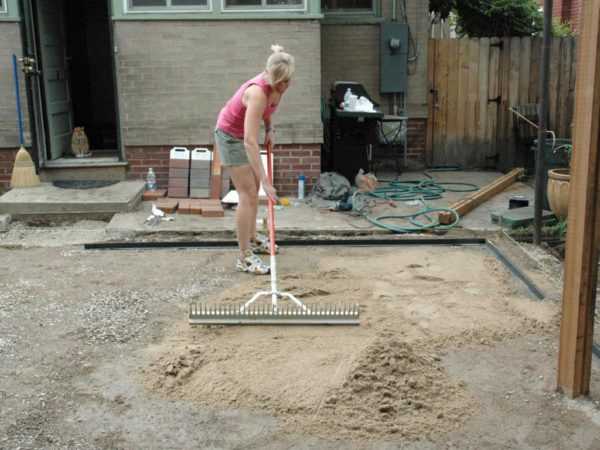 Вся территория выравнивается с помощью граблей и тщательно утрамбовывается, во избежание неровностей при укладке.