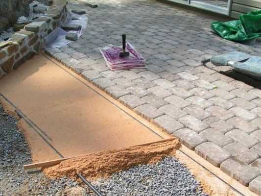 При сложном рельефе перед укладкой плитки делают основание из бетона, по которому настилают смесь из песка и цемента. На нее можно уложить брусчатку. Песок для затирки должен быть чистым, без корней, без семян растений. Под слой песка накладывается слой геотекстиля. Он не даст песку проваливаться сквозь щебень и защитит от развития растений. Ходить по поверхности, уложенной плиткой, можно через 2-3 дня после окончания всех работ.