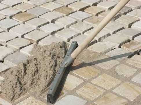 - После завершения всех работ по укладке изделий по поверхности площадки необходимо рассыпать песок. С помощью специальной щетки с жесткой щетинкой сделать затирку всех швов. В качестве альтернативы песку можно взять сухую смесь песка и цемента, которую нужно готовить в пропорции 1:3.