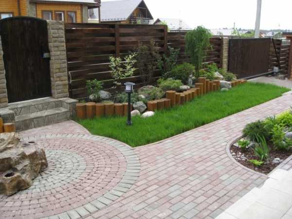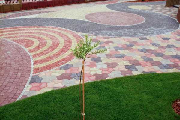 Насколько оригинально оформление двора этим строительным материалом смотрите на тротуарную плитку во дворе частного дома на фото:
