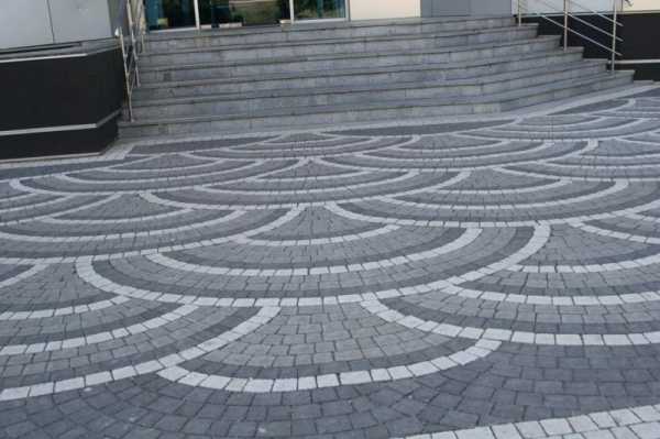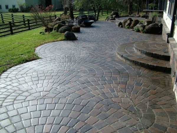 Укладка плитки по определенному шаблону с крупными круговыми фигурами является самым изысканным способом. Такие рисунки прекрасно смотрятся с высоты, например, с балкона дома. Эти узоры могут быть в виде концентрических кругов, напоминающих таинственные рисунки на полях, или в виде листьев исполинских деревьев, как будто упавших на мостовую.
