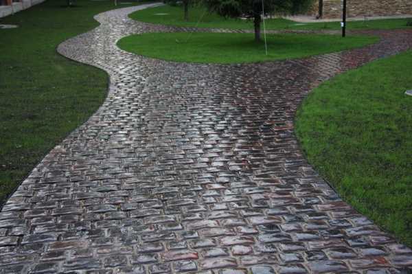 Проще всего уложить брусчатку в хаотическом порядке. Такие дорожки с неопределенным узором привлекают внимание своей пестротой и непредсказуемостью. Они очень естественно смотрятся при создании ландшафтного дизайна на участке.