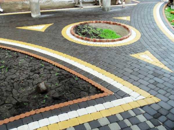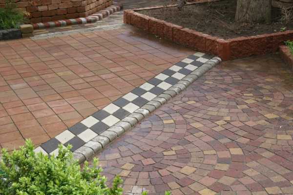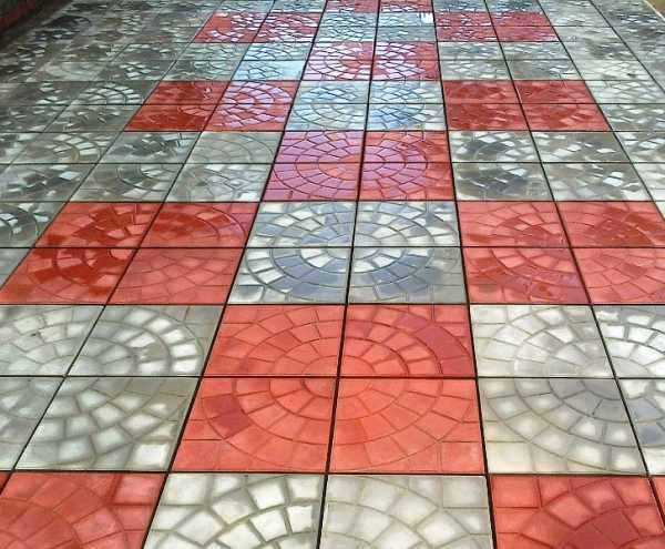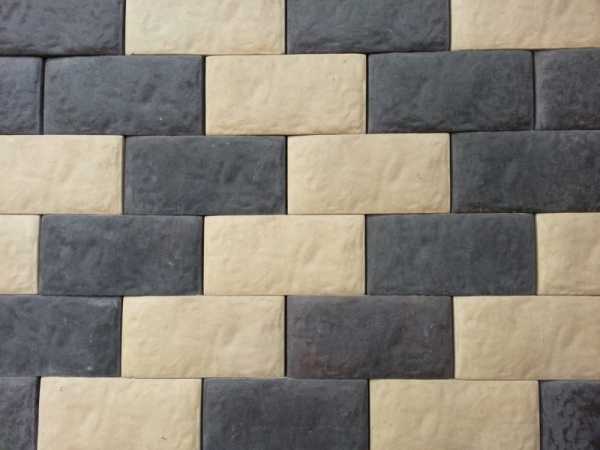 Сочетание разных цветов позволяет создать даже из такого обычного материала оригинальный орнамент. Это может быть двухцветное или многоцветное решение. Рисунок можно выложить в форме змейки или последовательности геометрических фигур. Популярным является укладка плитки темных и светлых тонов в шахматном порядке.