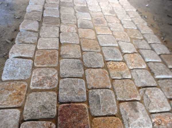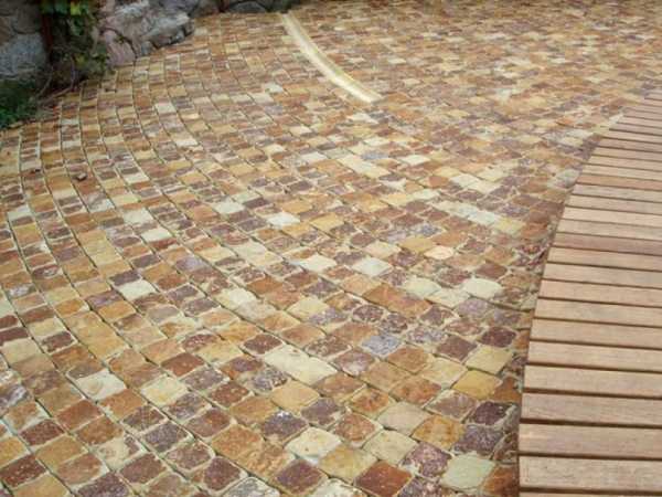 - Брусчатка – «прародительница» тротуарной плитки, имеющая большую популярность. Для ее создания используют толстую плитку прямоугольной формы с характерной цветовой гаммой.