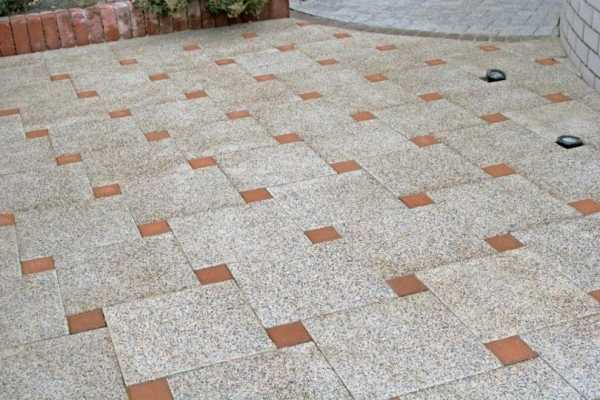 Обычно для монтажа выбирают либо квадратные элементы мощения с размером стороны 300-600 мм, либо брусчатку (прямоугольные ФЭМ определенной толщины). В этом случае площадка получается с равномерным рисунком по всей поверхности. Также можно экспериментировать с цветом: подчеркнуть отмостку, выделить края дорожек или акцентировать внимание в центре. Если сочетать серые (неокрашенные) модули и цветные (желтые, коричневые, красные), то количество дизайнов существенно увеличивается. Самыми распространенными из них считаются диагональная или шахматная укладка.