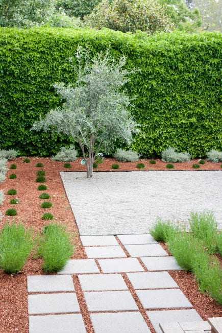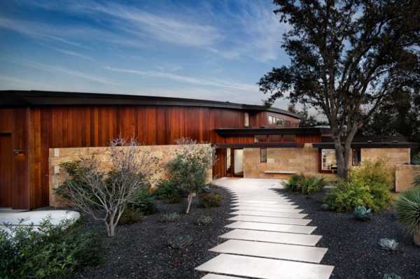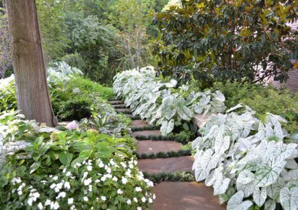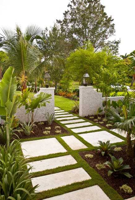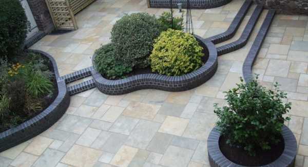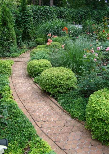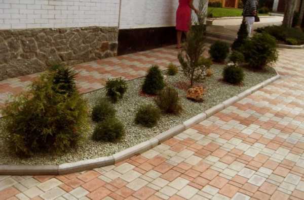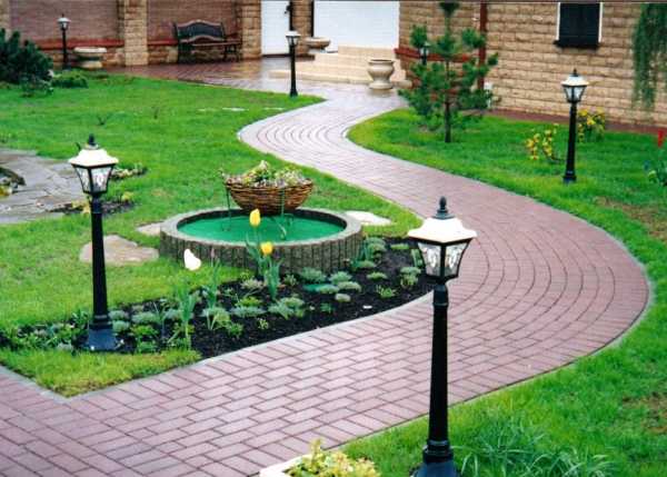 Сочетание дорожки и садовой растительности является очень оригинальным решением при создании композиции из тротуарной плитки во дворе частного дома. Фото таких дорожек и площадок с клумбами посредине, напоминают изображения оазисов в пустыне.