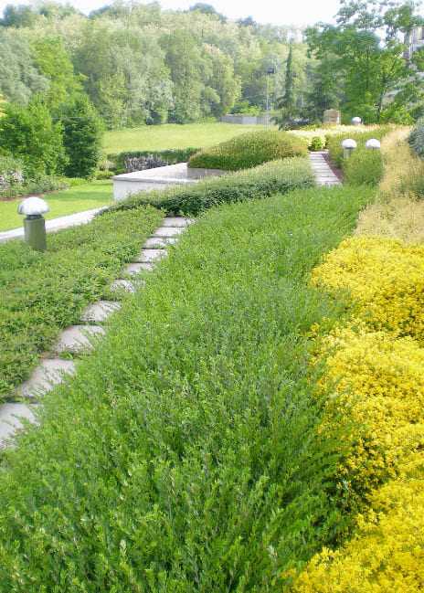 Эффектно оформить территорию можно и в том случае, если выбрать фигурные ФЭМ – Катушку, Волну, Чешую, с помощью которых создают оригинальные узоры по сложным схемам. Посмотрите фото, чтобы выбрать подходящий для вашего двора.