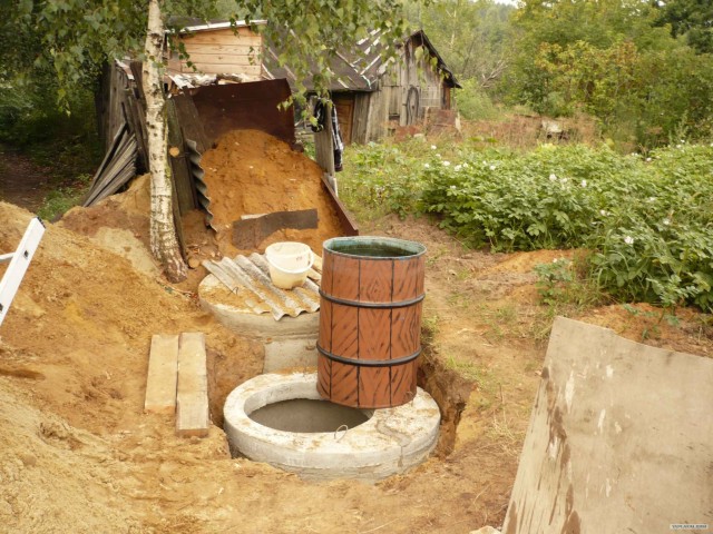 Для этих целей может подойти жесткая полиэтиленовая бочка большой вместимости или оцинкованная металлическая. Можно самостоятельно построить опалубку и залить бетонную емкость, однако опыт показывает недолговечность подобной конструкции по причине высокой агрессивности выгребного содержимого. Дальнейший ремонт такой конструкции практически невозможен. Вставные же бочки можно со временем заменить, не меняя местоположения туалета. Емкость вкапывают практически на всю глубину, оставляя не закопанной на высоте 70–80 мм. Это делается для того, чтобы в дальнейшем ее легче было демонтировать.