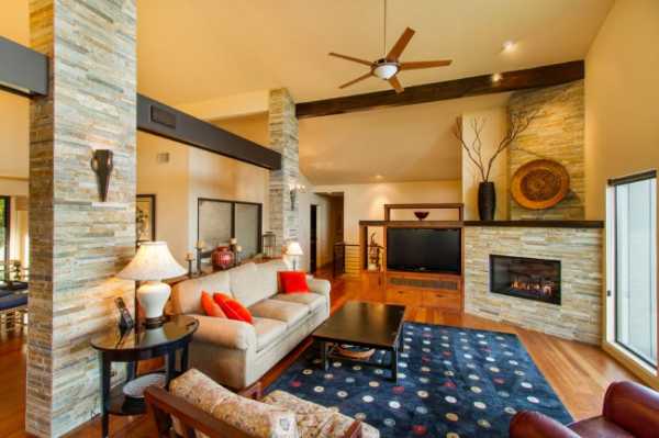 Камин с отделкой декоративным камнем в интерьере уютной гостиной