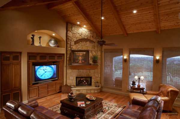 Угловой камин в стиле кантри в интерьере гостиной загородного дома