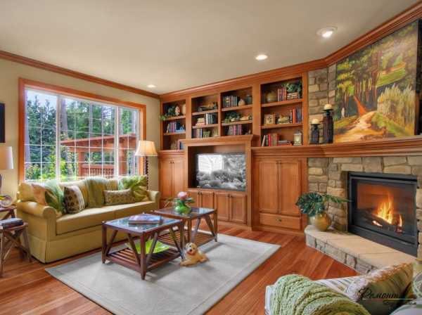 Угловой камин стоит располагать в противоположном углу от дверейПоэтому есть смысл хорошо продумать его расположение и общий интерьер комнаты: