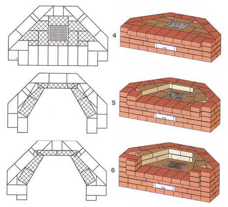 После третьего ряда заднюю стенку не выкладываем, идем только по боковым. Это нужно для организации перевала. Он гарантирует, что искры не будут вылетать из трубы и не возникнет задымление, которое часто наблюдается при перепаде воздушных потоков.