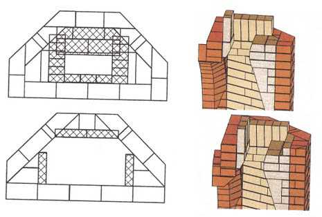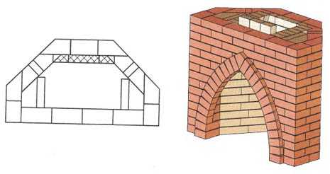 Арка является неотъемлемым элементом каждого камина, для нее используют специальный фигурный камень. Сверху него укладывают специальным образом нарезанные кирпичи на ребро. Перекрытие топки осуществляется путем укладки кирпича со смещением к углу. Для красивого внешнего вида по периметру вокруг топки укладывают обычный кирпич. С помощью этой кладки прикрывается смещение дымохода и осуществляется перекрытие расстояния между дымоходом и кладкой по периметру. Привлекательно выглядит навешивание – два верхних ряда смещают вперед и в стороны для организации обратной ступени. Дымоход выводят в отверстие в стене, предназначенной для монтажа отводной трубы.