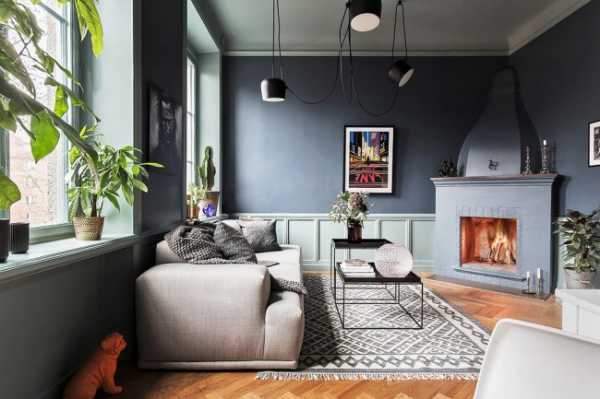 - Комнату можно оформлять в более холодные тона, так они лучше гармонируют с тёплым видом камина.