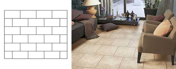 Рассматривая далее способы укладки пола, можно заметить вариант обустройства вразбежку. Данная разновидность напоминает стандартную кирпичную кладку. Такой вид достаточно оригинальный и часто встречается. Наиболее хорошим вариантом для него становится укладка прямоугольной плитки. Но при том, более часто используется стандартная квадратная. Такая вариация поможет избавится от возможного эффекта момнотонности и создать некую историческую атмосферу. А кроме того, поможет скрыть с глаз возможные небольшие дефекты поверхности.