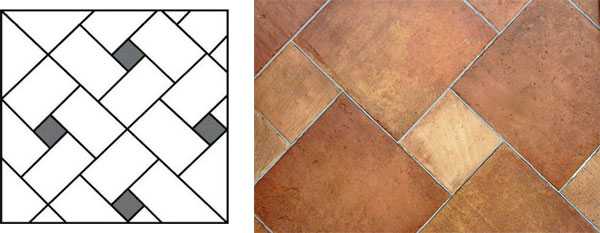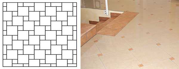 Рассматривая все способы укладки напольной плитки, особенностью этого является расположение каждого отдельного элемента с поворотом в разные стороны, при этом в основу заложено диагональное расположение. При этом, такая техника позволяет минимизировать количество отходов.
