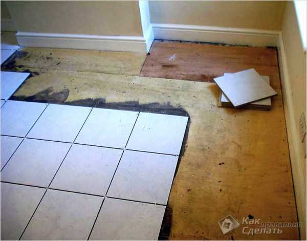 - Укладка керамической плитки на деревянный пол. Это наиболее сложный способ. Если полы в квартире деревянные, их лучше снять и залить стяжку, на которую уложить плитку. Однако в некоторых случаях сделать это невозможно. Особенно это касается старых домов с деревянными перекрытиями. В таком случае пол выравнивается при помощи ДСП, затем обрабатывается при помощи щелочи. После этого можно укладывать плитку.