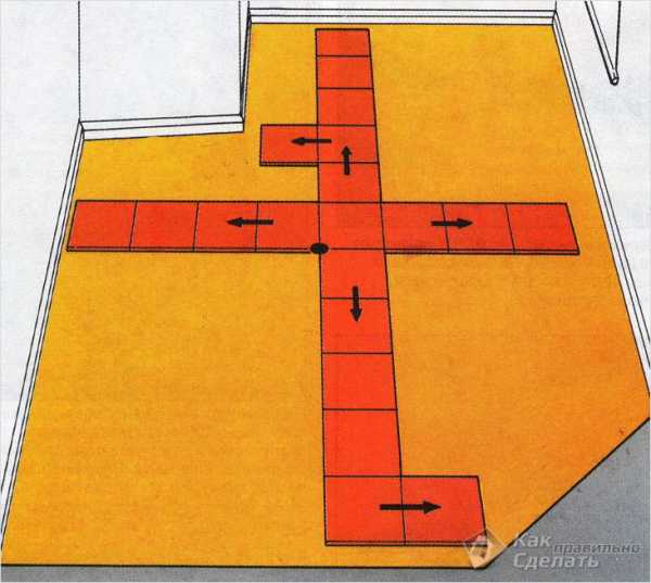 Самый простой ‒ начинать с одного дальнего угла комнаты. Такой метод считается наиболее быстрым. Так укладывают все начинающие плиточники, или если работать предстоит в небольших узких помещениях, либо комнатах со сложной геометрией.