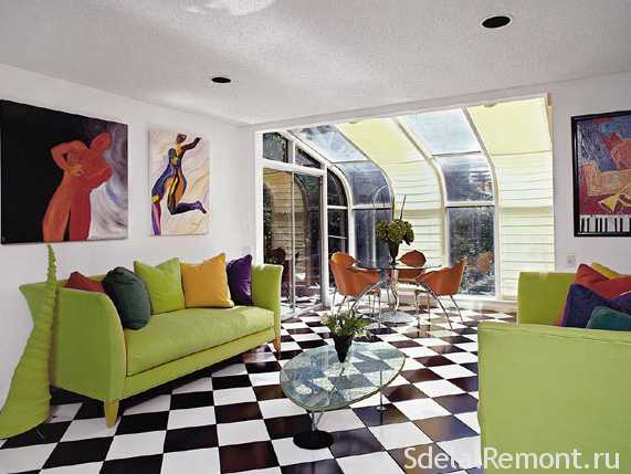Полы, выложенные по диагонали из черно-белой плитки визуально вытягивают комнату и придают ей необычность и загадочность. У попадающего в такой интерьер меняется восприятие действительности из-за окружающего его обилия форм и красок. Несмотря на то, что напольное покрытие как бы существует отдельно от всех имеющихся в комнате аксессуаров, интерьер достаточно гармоничен. Конечно же, не каждый владелец квартиры захочет иметь в жилых помещениях такие импульсивные цветовые сочетания, но их можно заменить на более спокойные и теплые оттенки. При таких изменениях комната приобретет совершенно другой характер.