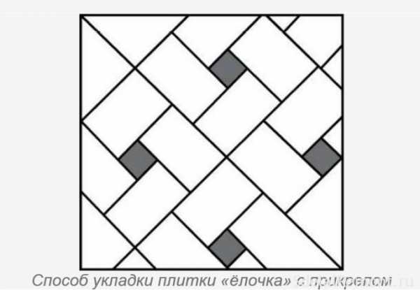 - Паркетная (елочка). Для новичков представляет сложность. Фрагменты нужно укладывать под 45 градусов к стене, чередуя наклон влево и вправо, в результате чего на полу образуется рисунок, традиционный для паркета. Используется для прямоугольной плитки. Требует опыта работы.
