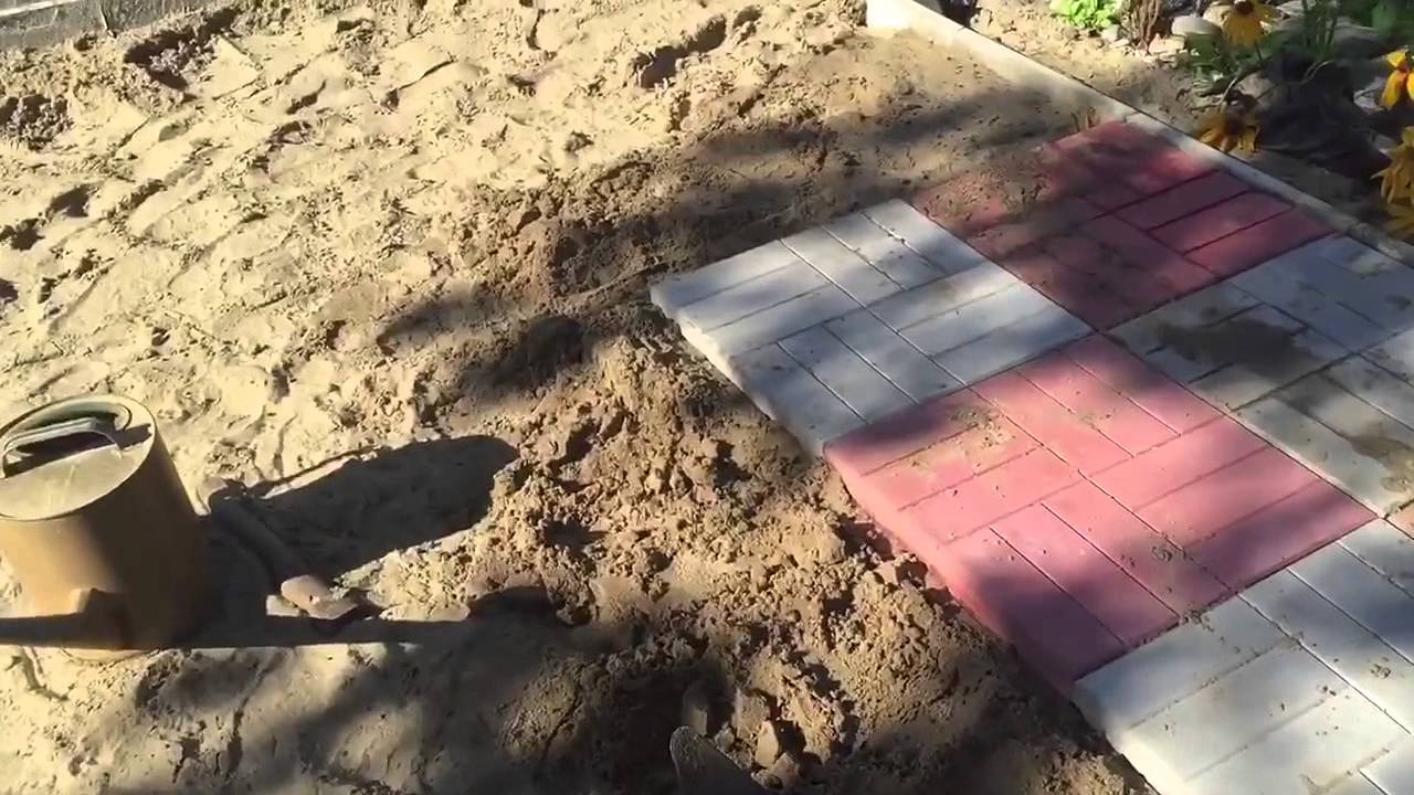 В этом случае расстояние между бордюрами (или натянутой нитью при их отсутствии) заполняется песком. Высота песчаного слоя составляет 50-60 мм. Перед работой песок поливают водой с использованием распылителя и оставляют немного просохнуть. Далее его выравнивают и трамбуют. Выкладка производится на влажный, но не мокрый песок.