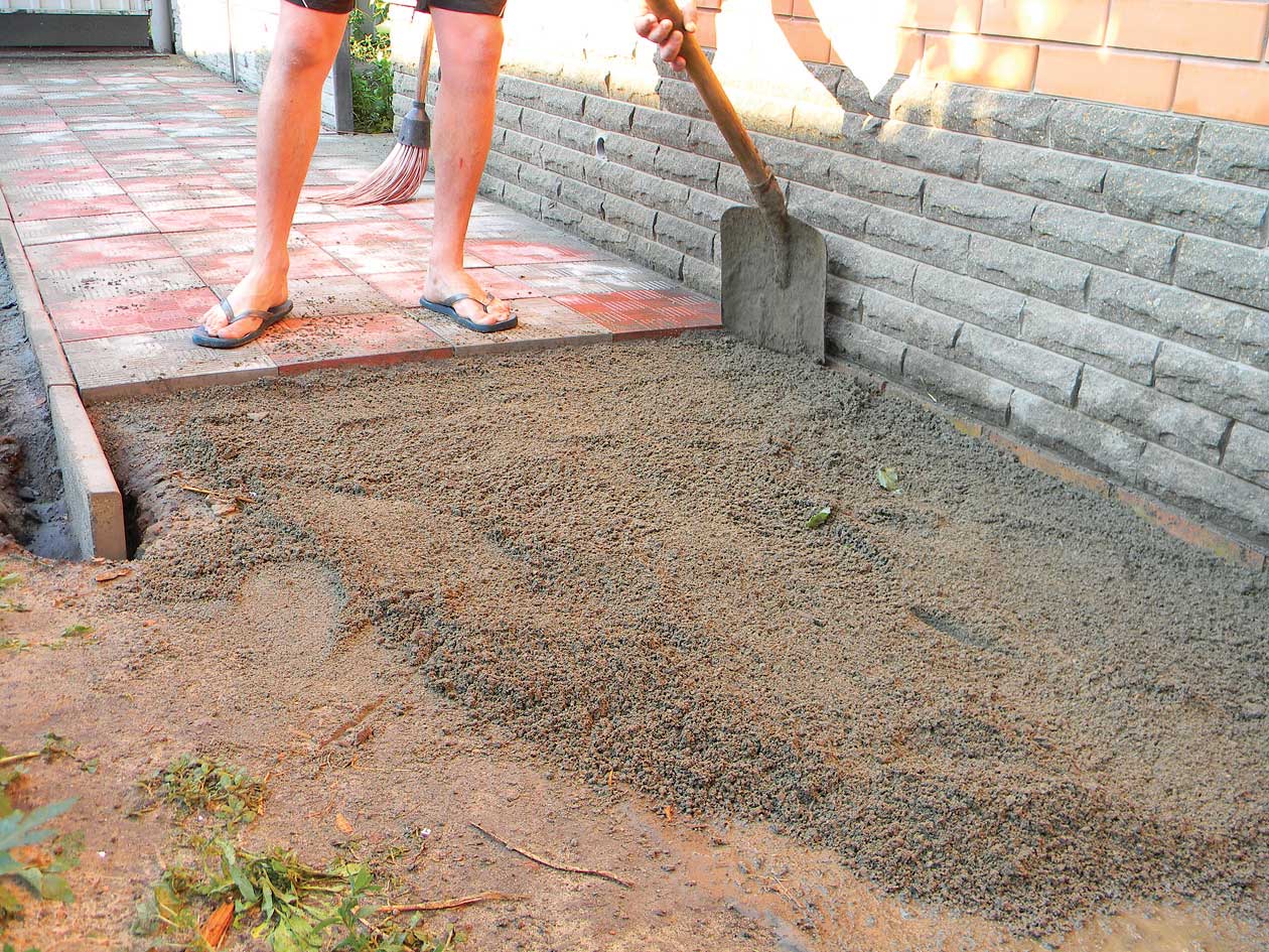 Для засыпки применяют мытый кварцевый или карьерный песок, кристаллы которые имеют острые грани. Благодаря этим частицам расклиниваются зазоры, не выдуваются и не вымываются дождями.