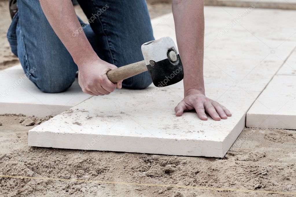 «Посадка» тротуарной плиткиПлитка укладывается в предназначенное для нее место и устанавливается точно путем легкого постукивания по ней резиновым молотком. Если плитка проваливается под нее подсыпается песок или смесь.