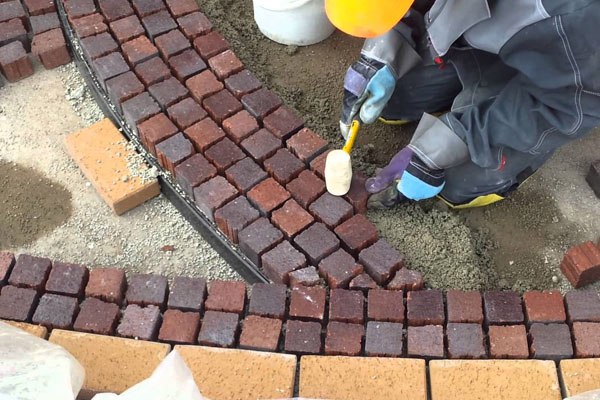 Укладку начинают действовать с нижней точки в направлении от себя. Сначала монтируют целую брусчатку на всем поле работ, затем подрезают элементы и заполняют ими пустые участки. По покрытию сразу можно ходить, но наступать на выровненный подстилающий одет внутрь.