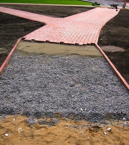 Получившееся ложе засыпается дренажным несущим слоем, например, щебнем или гравием высотой в 150-200 мм. Для автомобильной дорожки (площадки) толщина слоя увеличивается до 400 мм. Многие укладывают под гравий и на него геотекстиль, чтобы исключить вероятность размывания подушки грунтовыми водами. Сверху щебня засыпается 20 мм. песка, для выравнивания основания.