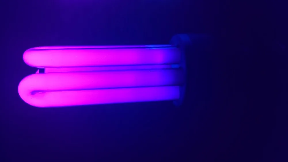 Она лишена люминофора, благодаря этому ультрафиолетовое излучение не превращается в свет и свободно проходит через тонкое стекло, из которого сделаны трубки. Вот как выглядит лампа сразу после включения.