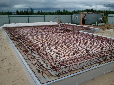 Фундаментная плита образуется путем заливки бетона в «форму» из теплоизоляции. В плиту может быть интегрирована система подогрева пола, которая может служить для отопления дома. Теплоносителем в системе может служить горячая вода или антифриз (если зимой в помещении не будет возможности всегда поддерживать плюсовую температуру). В качестве отопительных трубопроводов могут использоваться практически все виды труб: стальные (из нержавеющей стали) металлопластиковые, медные, полипропиленовые, полибутиленовые и т.д.