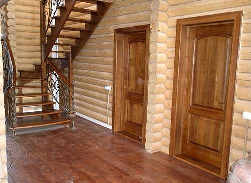 Внутри дома из бруса или бревна принято устанавливать двери из массива дерева или материалов, имитирующих древесину – выбор зависит от характера отделки и выбранного стиля интерьера, требований к эксплуатационным качествам конструкций.