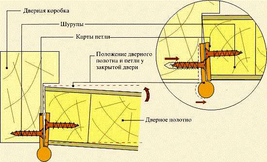 На следующем этапе навешивается полотно двери. Преимущественно используется четыре петли. Принцип установки зависит от их типа: