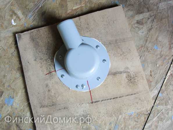 Одеваем фанерку на трап, снизу просовываем руку и маркером делаем метки, чтобы понять как трап расположен относительно краев. Затем снимаем трап с трубы