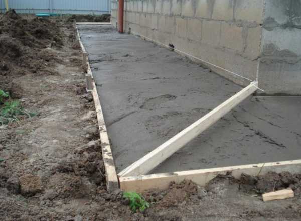 После всех этих «процедур» заливается и выравнивается жидкий бетон. По всей поверхности бетона делаются деформационные швы. Устройство бетонной отмостки предполагает наличие деформационных швов, для этого примерно каждые 3 метра устанавливаются деревянные рейки.