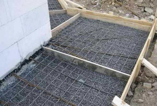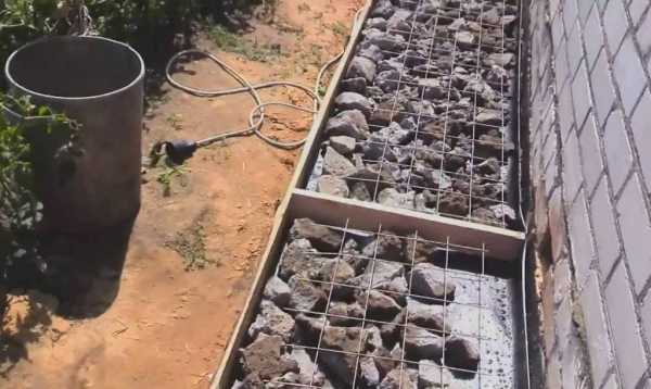 Для усиления конструкции берется металлическая сетка с размерами 50х50 (100х100 мм) и куски арматуры, зафиксированные в цоколе с шагом 0,75 м. Сетку поднимают над щебнем на 30 мм, а бетонную основу смешивают и заливают самостоятельно.