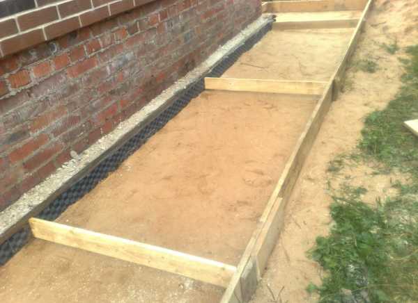 Донный слой углубления оборудуется системой водоотвода, поверх которой насыпается 10-20 см песка. Точные показатели толщины этой насыпи определяются разновидностью отмостки и глубиной ее размещения. Песок тщательно выравнивается и трамбуется.