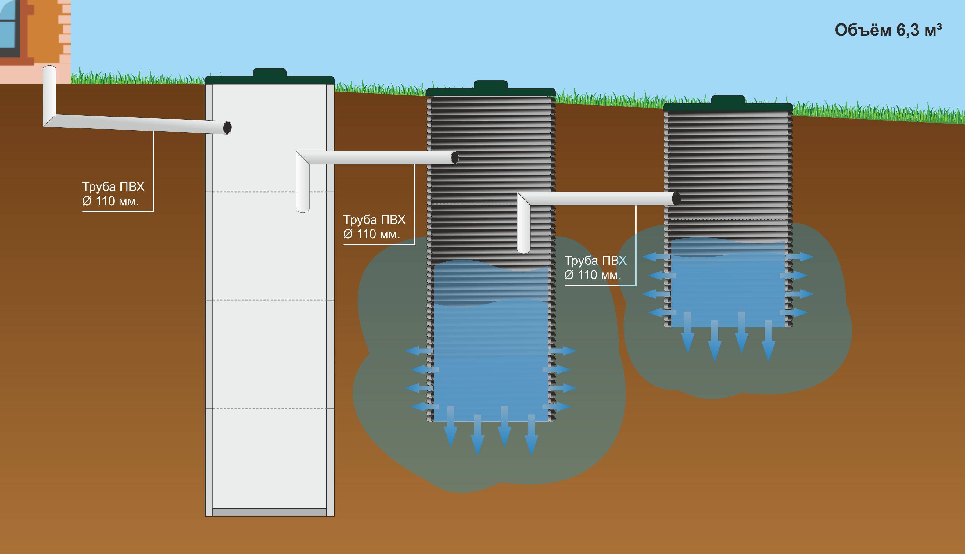 Схема очистной установки, не требующей частой откачки, зависит от количества стоков в доме.