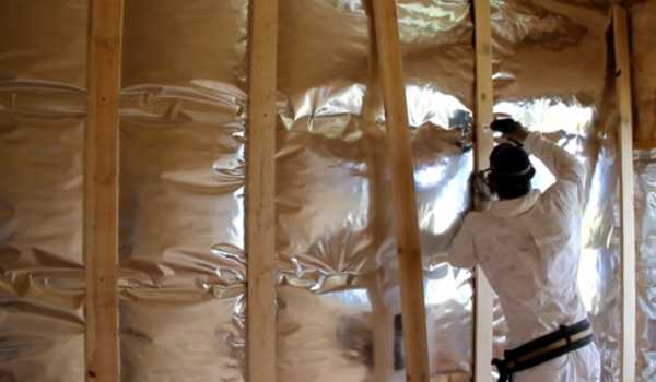 На стены крепится гидроизоляционная пленка. Подготавливается каркас из дерева. Между его балками укладываются и фиксируются пластиковыми грибками плиты пенопласта. При необходимости дополнительных прослоек, они закрепляются над основным слоем.