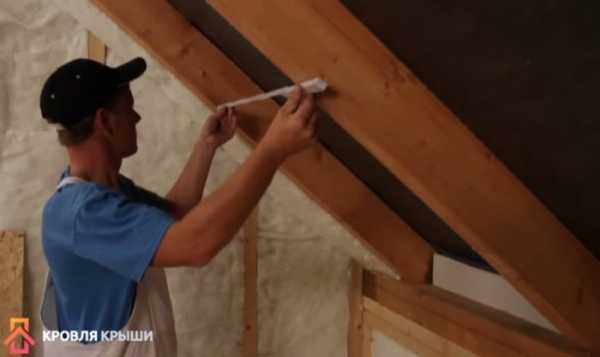 - Снизу к торцам стропил степлером крепится пароизоляционная пленка. Стыковать ее необходимо внахлест, проклеивая стыки специальным скотчем.