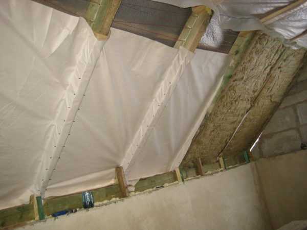 - на доски между стропилами выстилаем пароизоляцию либо слой пропитанной битумом бумаги, который будет удерживать частицы минеральной ваты от проскальзывания сквозь опору и попадания в воздух нижних этажей;
