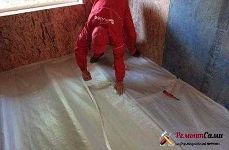 Если выбор пал на пенопласт, то его использование даст возможность получить монолитное покрытие теплоизоляционного типа. Начать следует с того, что укладывается такой утеплитель только на ровную поверхность, а значит, все неровности на полу необходимо предварительно убрать. После этого на основание настилают пароизоляционный слой.