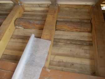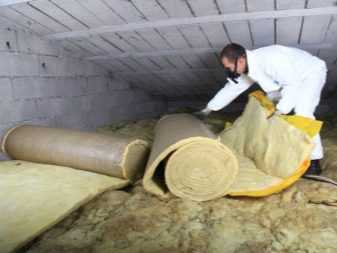 Если требуется утеплить перекрытия минеральной ватой, то сначала на перекрытие и лаги укладывают слой пароизоляции. Как правило, для создания такого слоя можно использовать фольгу, полиэтилен или же специальную мембрану. Ее укладывают внахлест, а места стыков смазывают клеем, после чего сверху настилаются рулоны утеплителя. Также минеральную вату помещают между стропилами.
