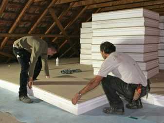 Также возможно провести утепление чердака пенополистиролом. Обычно его применяют в старых домах, где перекрытия выполнены из дерева. Он отлично удерживает тепло и не формирует какую-либо нагрузку на несущие конструкции. Кроме того, пенополистирол легко режется и монтируется. Также стоит отметить, что он совершенно не впитывает воду и является экологически чистым материалом.