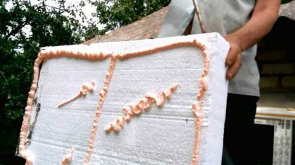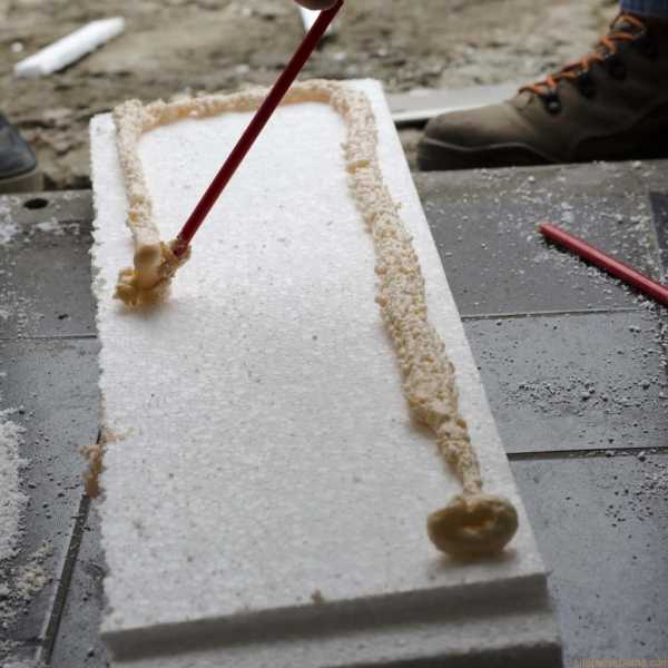 - Заделка швов. Если швы между листами превышают 30 мм, то в них вклеиваются кусочки (обрезки) пенополистирола. Окончательно все швы заполняются монтажной пеной, которая не должна содержать толуола, способного растворять пластик. Лишняя масса срезается ножом, а затем, швы обрабатывается клеевым составом.