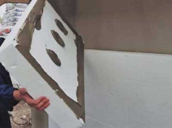 - Состав для фиксации теплоизоляции следует готовить в соответствии с инструкцией производителя в таком объеме, чтобы не допустить его преждевременного застывания. Массу делают заранее. Стены покрывают сплошным слоем клея. На пенополистирол раствор накладывают точечно, по краям и в центральной части.